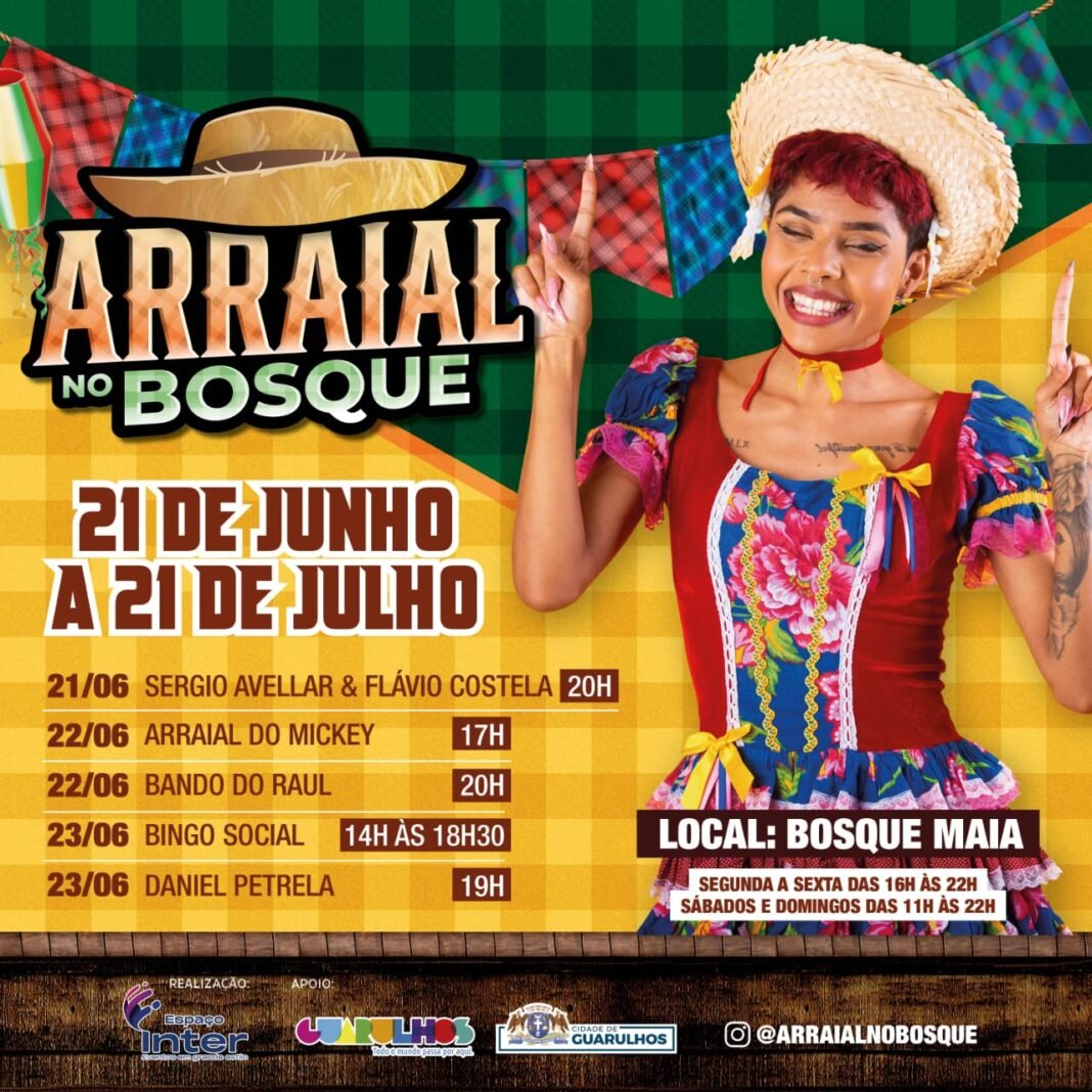 A partir desta sexta-feira, 21 de junho, a festa junina oficial de Guarulhos, o Arraial no Bosque, promete animar a cidade com diversas atrações para todas as idades, até 21 de julho.