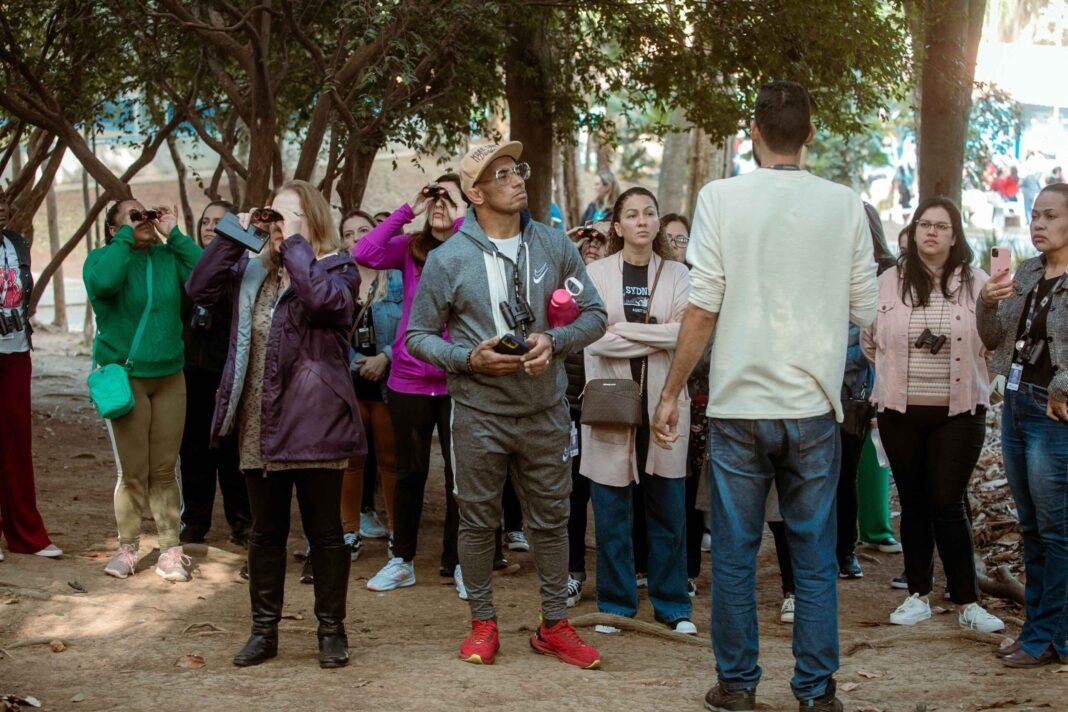 Depois das orientações teóricas, cada coordenador recebeu um binóculo para observar toda a riqueza natural do espaço. Ao transformar teoria em prática, os participantes avistaram o ninho do pássaro joão-de-barro e a árvore pau-brasil, entre outras espécies presentes na Mata Atlântica.