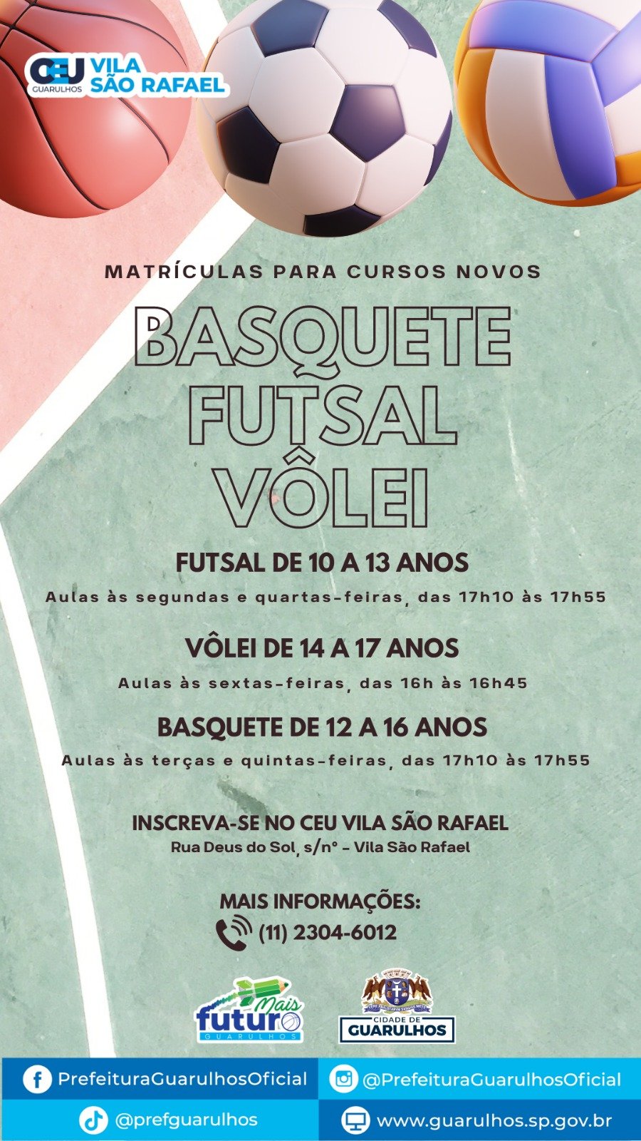 As inscrições para as aulas gratuitas de futsal, basquete e vôlei no CEU Vila São Rafael estarão abertas a partir de 15 de julho. As modalidades retornam após reforma no ginásio, que agora oferece infraestrutura moderna.