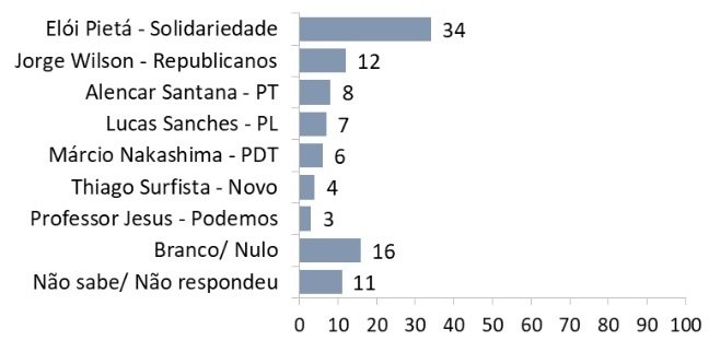 O ex-prefeito Elói Pietá (Solidariedade) aparece com ampla vantagem em relação aos demais candidatos e lidera a disputa com 34% das intenções de voto. Em outro patamar, Jorge Wilson (Republicanos) obtém 12% das menções e fica em situação de empate técnico, considerando a margem de erro da pesquisa que é de 3 pontos percentuais (p.p.), com Alencar Santana (PT) que é mencionado por 8% do eleitorado, Lucas Sanches (PL) por 7% e Márcio Nakashima (PDT) por 6%. Esses três últimos estão tecnicamente empatados também com Thiago Surfista (NOVO), que aparece com 4%, e com Professor Jesus (Podemos) que tem 3% das menções. Os que declaram intenção de votar em branco ou nulo somam 16% e 11% não sabem em quem votar.