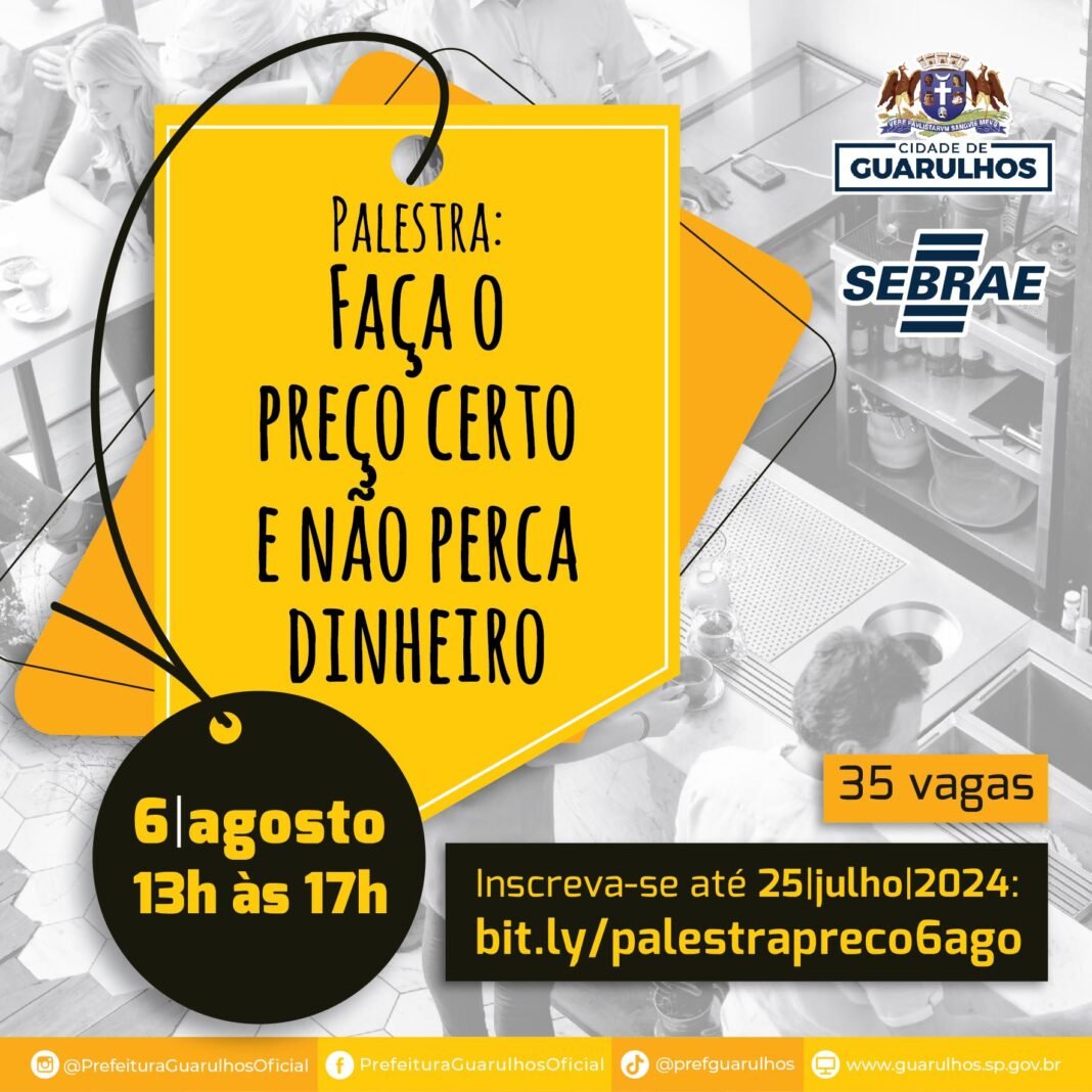 Microempreendedores individuais (MEIs) de Guarulhos terão a oportunidade de participar da palestra gratuita “Faça o preço certo e não perca dinheiro”, no dia 6 de agosto, no CIC Guarulhos Leonel Brizola. A formação, oferecida em parceria com o Sebrae, visa auxiliar os empresários a precificarem seus produtos e serviços de forma correta, evitando prejuízos.