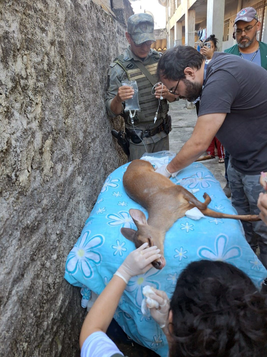 O animal silvestre está com escoriações nos cascos devido ao piso cimentado do quintal e no corpo por ter se chocado contra muros para tentar fugir. Seus ferimentos serão tratados e, assim que recuperado, será colocado em liberdade em área de soltura em seu habitat natural.