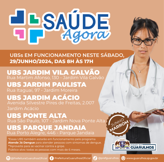 Neste sábado (29) a Prefeitura de Guarulhos abrirá cinco Unidades Básicas de Saúde (UBS) pelo programa Saúde Agora: as UBS Jardim Vila Galvão, Jardim Paulista, Jardim Acácio, Ponte Alta e Parque Jandaia funcionarão das 8h às 17h para prestar os atendimentos tradicionais, como vacinação e exames, bem como para atender pessoas com sintomas de dengue.