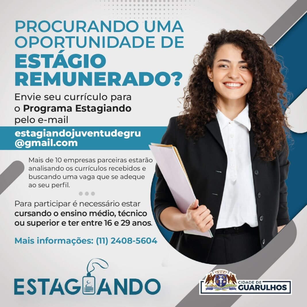 A Prefeitura de Guarulhos, por meio do projeto Estagiando, está recebendo currículos de estudantes entre 16 e 29 anos que estejam cursando o ensino médio, técnico ou superior. O objetivo é encaminhá-los para estágios remunerados em empresas parceiras. Os interessados devem enviar seus currículos atualizados para o e-mail [endereço de e-mail removido].