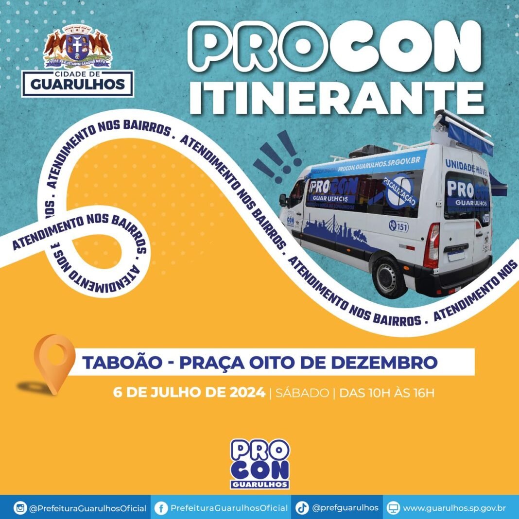 A unidade volante do Procon Guarulhos estará no sábado (6) na praça Oito de Dezembro, no Taboão, das 10h às 16h, para atender a população. Toda semana a van da Coordenadoria de Defesa e Proteção do Consumidor leva a um bairro diferente do município os mesmos serviços executados nas unidades fixas do Procon.